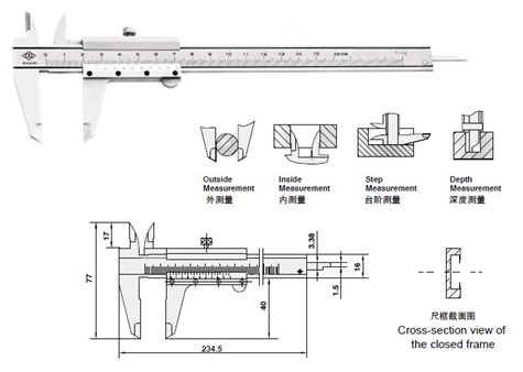 1) 使用前,應先擦干凈兩卡腳測量面,合攏兩卡腳,檢查副尺0線與主尺0線是否對齊,若未對齊,應根據原始誤差修正測量讀數。