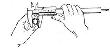 測量時,右手拿住尺身,大拇指移動游標,左手拿待測外徑(或內徑)的物體,使待測物位于外測量爪之間,當與量爪緊緊相貼時,即可讀數,如下圖所示:
