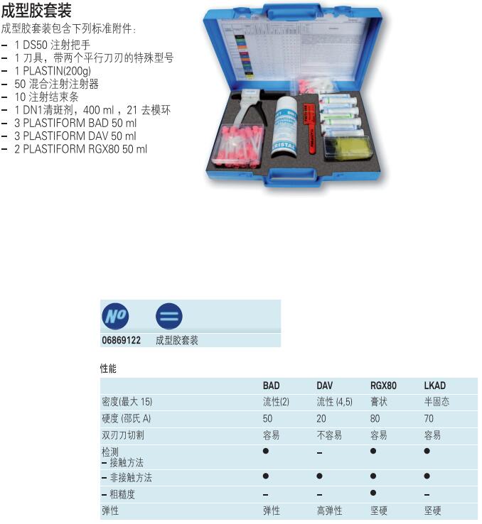 "PLASTIFORM成型膠"產品允許復制成型復雜的內加工部件,以便使用光學,非接觸測量儀進行觀測和檢查。"PLASTIFORM成型膠"包括兩部分組成,它需按相同比例的混合以達到合適的聚合。需要重新復制成型的測試部件表面必須非常干凈,表面不得有油類物質。