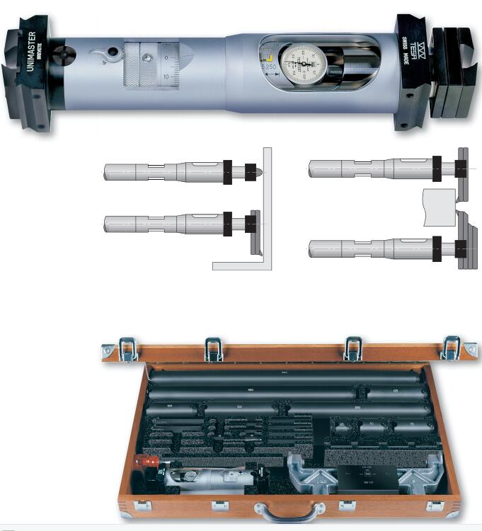 TESA UNIMASTER 與兩點接觸式內徑千分尺類似的方式測量工件,本量具配備的內置測桿只需要增加必要的加長桿就可完成可擴充應用范圍內任一尺寸的直接測量。